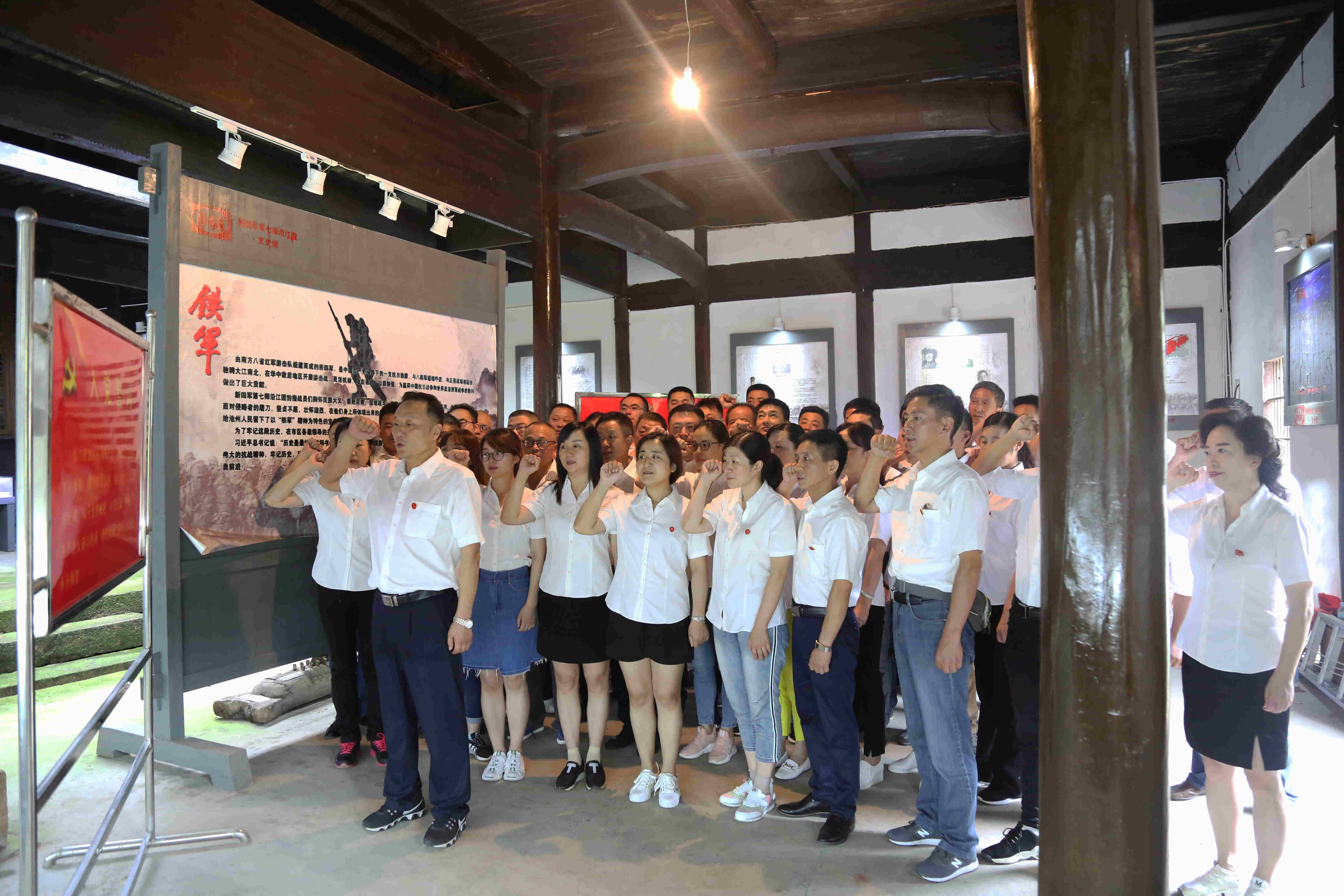 新四軍七師沿江團(tuán)是抗日戰(zhàn)爭時期堅持在皖江地區(qū)進(jìn)行抗日斗爭的主力部隊,在八年抗日斗爭中,第七師沿江團(tuán)在黨的領(lǐng)導(dǎo)下,歷盡艱難曲折,為民族解放戰(zhàn)爭作出了巨大的犧牲,以其輝煌的業(yè)績載入革命史冊。在大廳內(nèi),全體黨員在黨委書記何族興的帶領(lǐng)下,面向黨旗莊嚴(yán)宣誓,重溫入黨誓詞,更加堅定了為共產(chǎn)主義事業(yè)奮斗終身的理想信念。