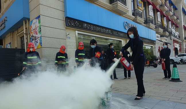 隨著警報(bào)聲響起,應(yīng)急疏散演練正式開始,客戶中心工作人員在疏散組的引導(dǎo)下捂住口鼻、彎下腰,有序撤離出客戶中心大廳。從拉響警報(bào)至所有人員安全撤離至演練集合點(diǎn),前后僅用時(shí)兩分二十秒。隨后,參加演練人員又在演練總指揮的指導(dǎo)下,輪流站在火源上風(fēng)位置,左手緊握滅火器鴨舌把并在提起后用力向下壓把手,右手把拉環(huán)迅速抽出后將噴嘴對(duì)準(zhǔn)火源進(jìn)行噴灑。