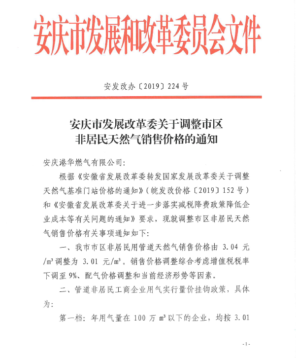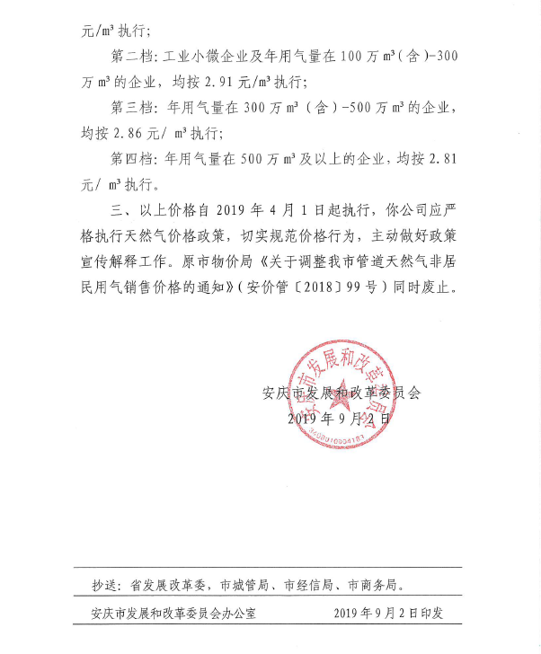 安慶市發(fā)展改革委關(guān)于調(diào)整市區(qū)非居民天然氣銷售價(jià)格的通知(2019)