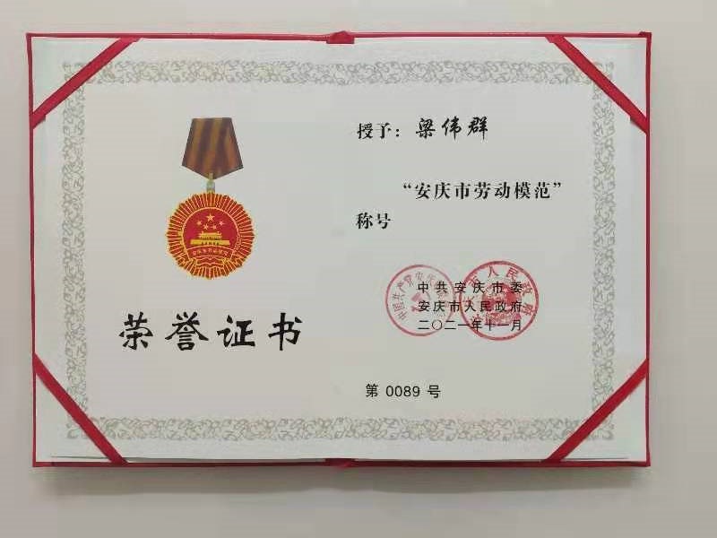近日,在市委、市政府召開的市勞動模范、先進(jìn)工作者和先進(jìn)集體表彰大會上,公司員工梁偉群被授予“安慶市勞動模范”。