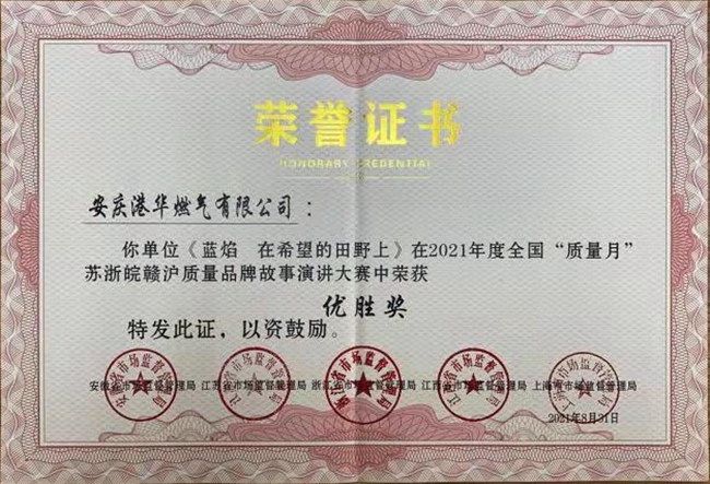日前,安慶港華燃氣選送演講視頻作品《藍焰 在希望的田野上》榮獲2021年全國“質(zhì)量月”蘇浙皖贛滬質(zhì)量品牌故事演講大賽優(yōu)勝獎。