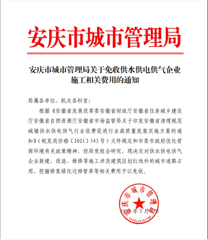 安慶市城市管理局關于免收供水供電供氣企業(yè)施工相關費用的通知