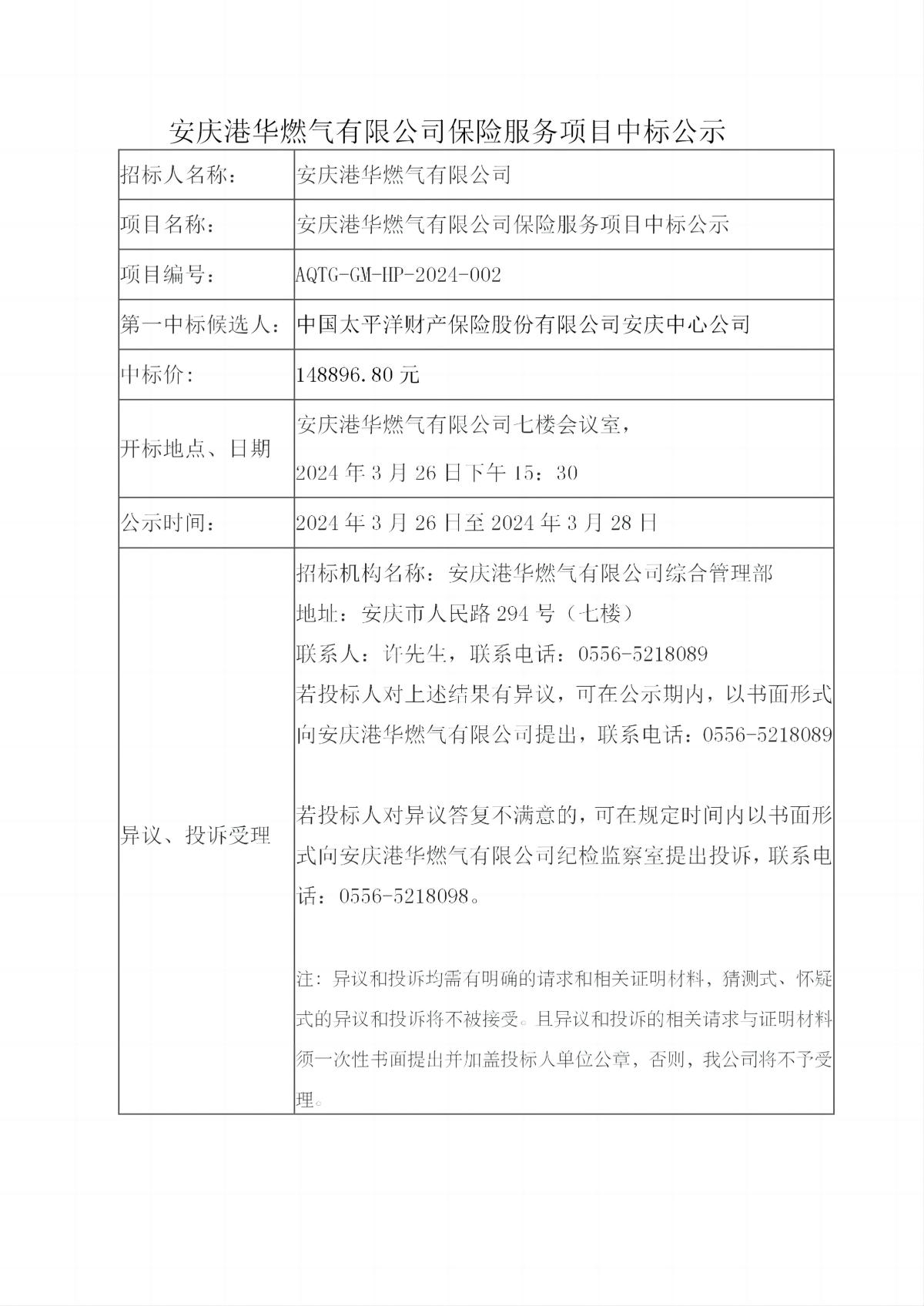 安慶港華燃氣有限公司保險服務項目中標公示