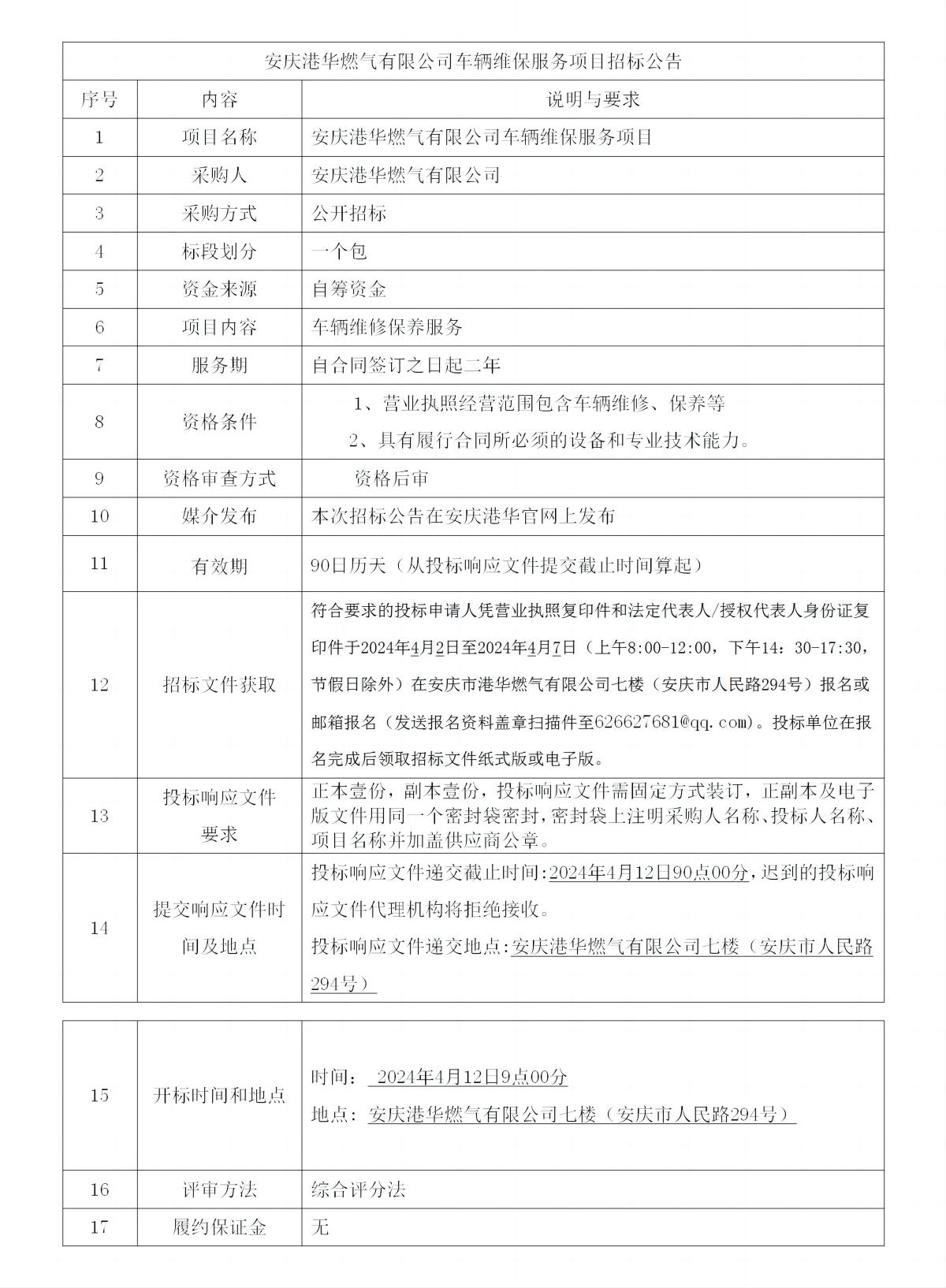 安慶港華燃?xì)庥邢薰拒囕v維保服務(wù)項(xiàng)目招標(biāo)公告