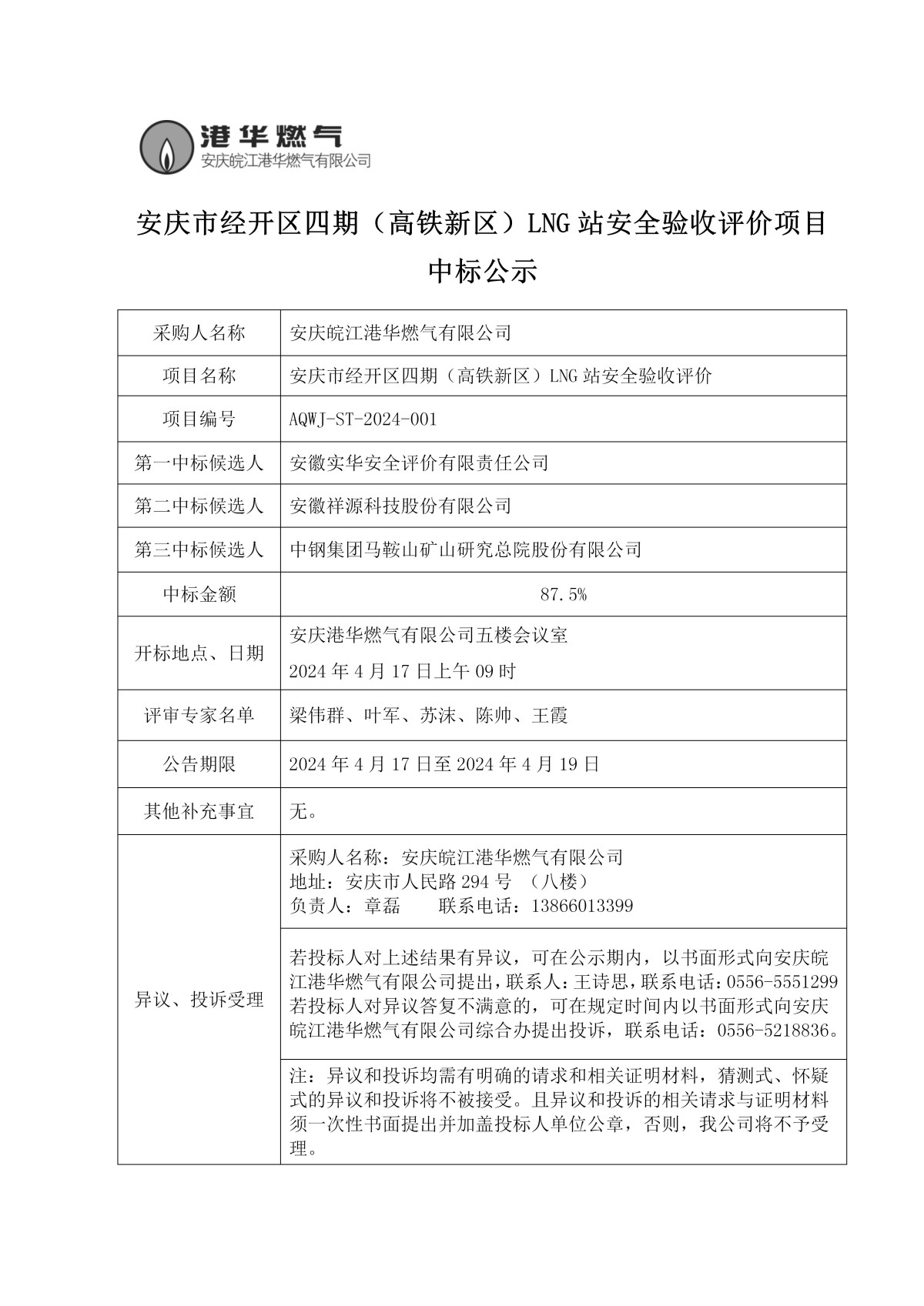 安慶市經(jīng)開區(qū)四期(高鐵新區(qū))LNG站安全驗(yàn)收評(píng)價(jià)項(xiàng)目中標(biāo)公示