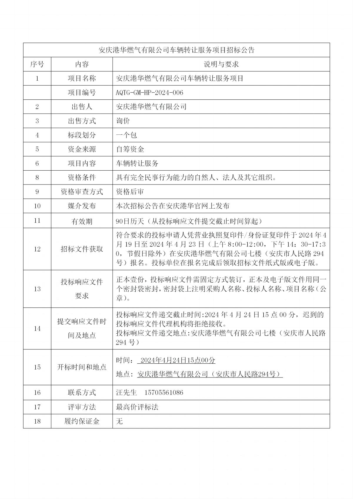 安慶港華燃?xì)庥邢薰拒囕v轉(zhuǎn)讓服務(wù)項(xiàng)目招標(biāo)公告 發(fā)布時(shí)間:2024-04-19    閱讀次數(shù):3687次