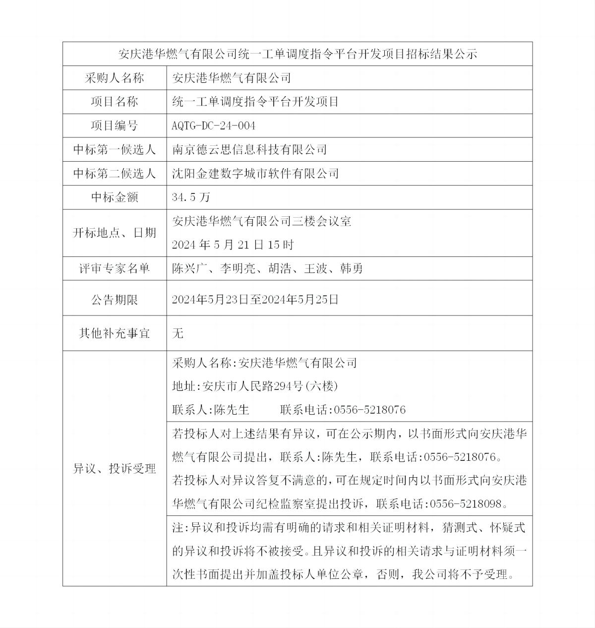 安慶港華燃氣有限公司統(tǒng)一工單調度指令平臺開發(fā)項目招標結果公示