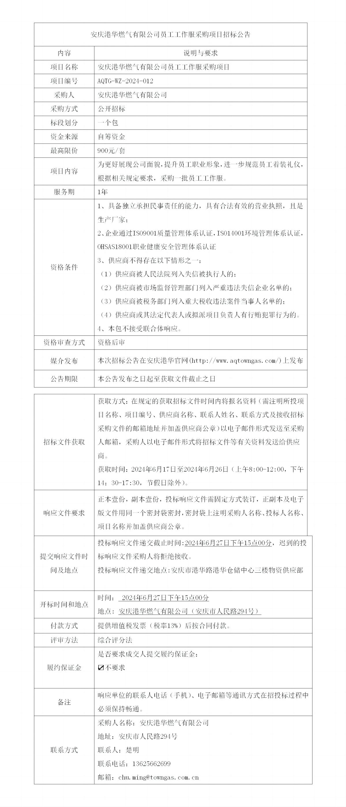 安慶港華燃?xì)庥邢薰締T工工作服采購(gòu)項(xiàng)目招標(biāo)公告 發(fā)布時(shí)間:2024-06-13    閱讀次數(shù):4084次