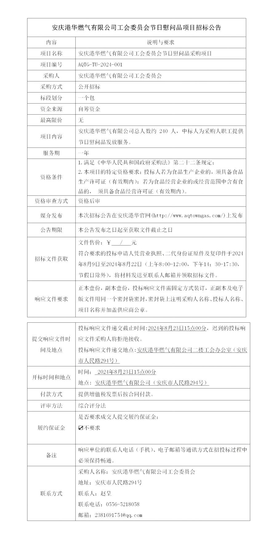 安慶港華燃氣有限公司工會委員會節(jié)日慰問品項目招標公告