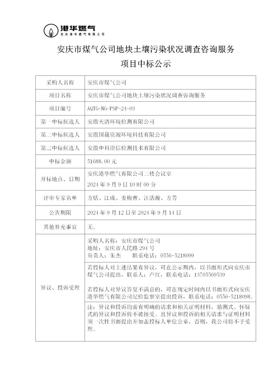 安慶市煤氣公司地塊土壤污染狀況調(diào)查咨詢服務(wù)項目中標(biāo)公示