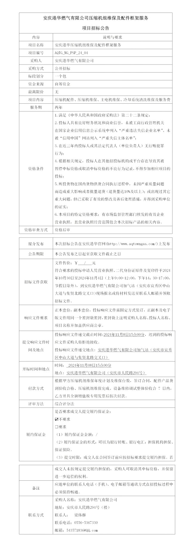 安慶港華燃氣有限公司壓縮機組維保及配件框架服務(wù)項目招標(biāo)公告