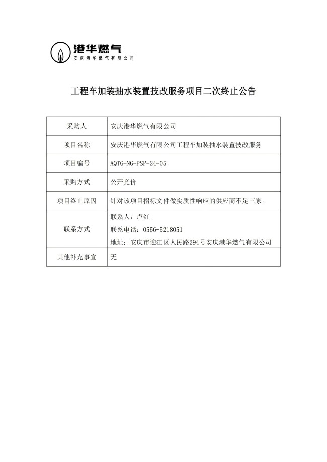 工程車加裝抽水裝置技改服務(wù)項目二次終止公告