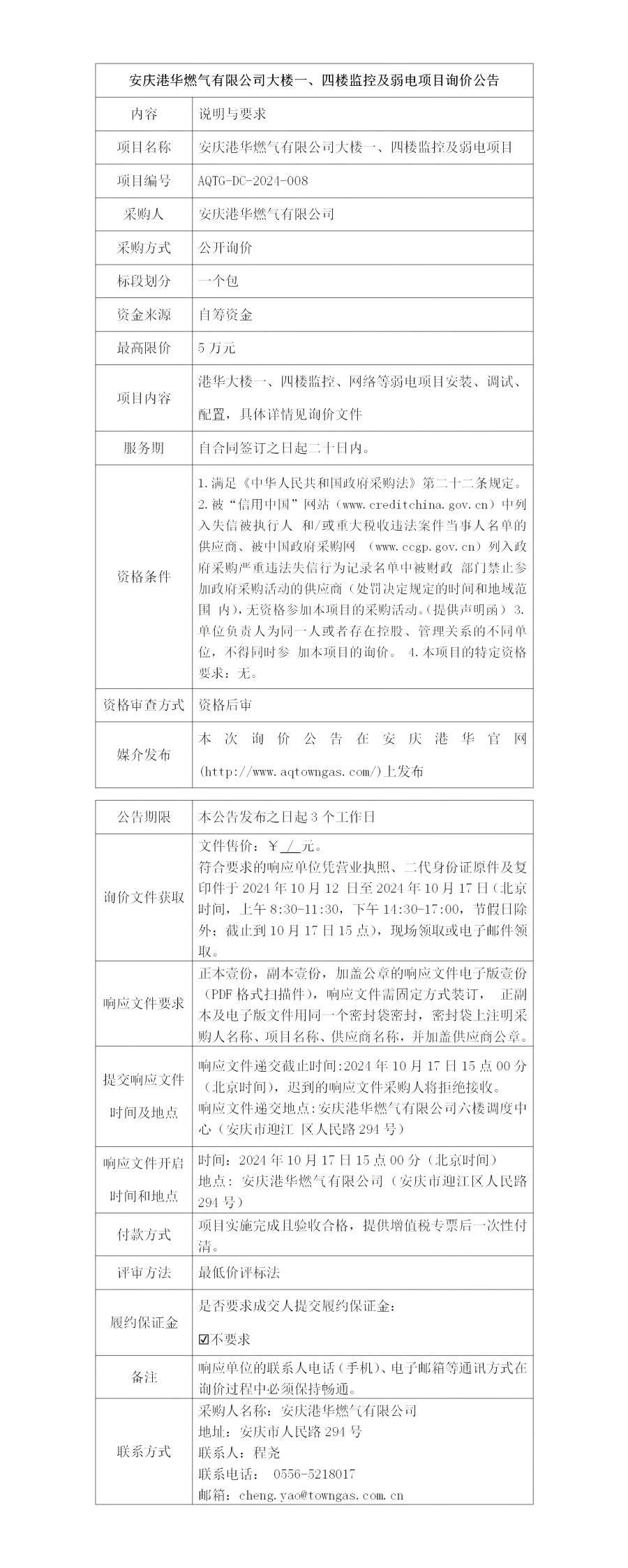 安慶港華燃?xì)庥邢薰敬髽且?、四樓監(jiān)控及弱電項(xiàng)目詢價(jià)公告 發(fā)布時(shí)間:2024-10-11    閱讀次數(shù):2992次