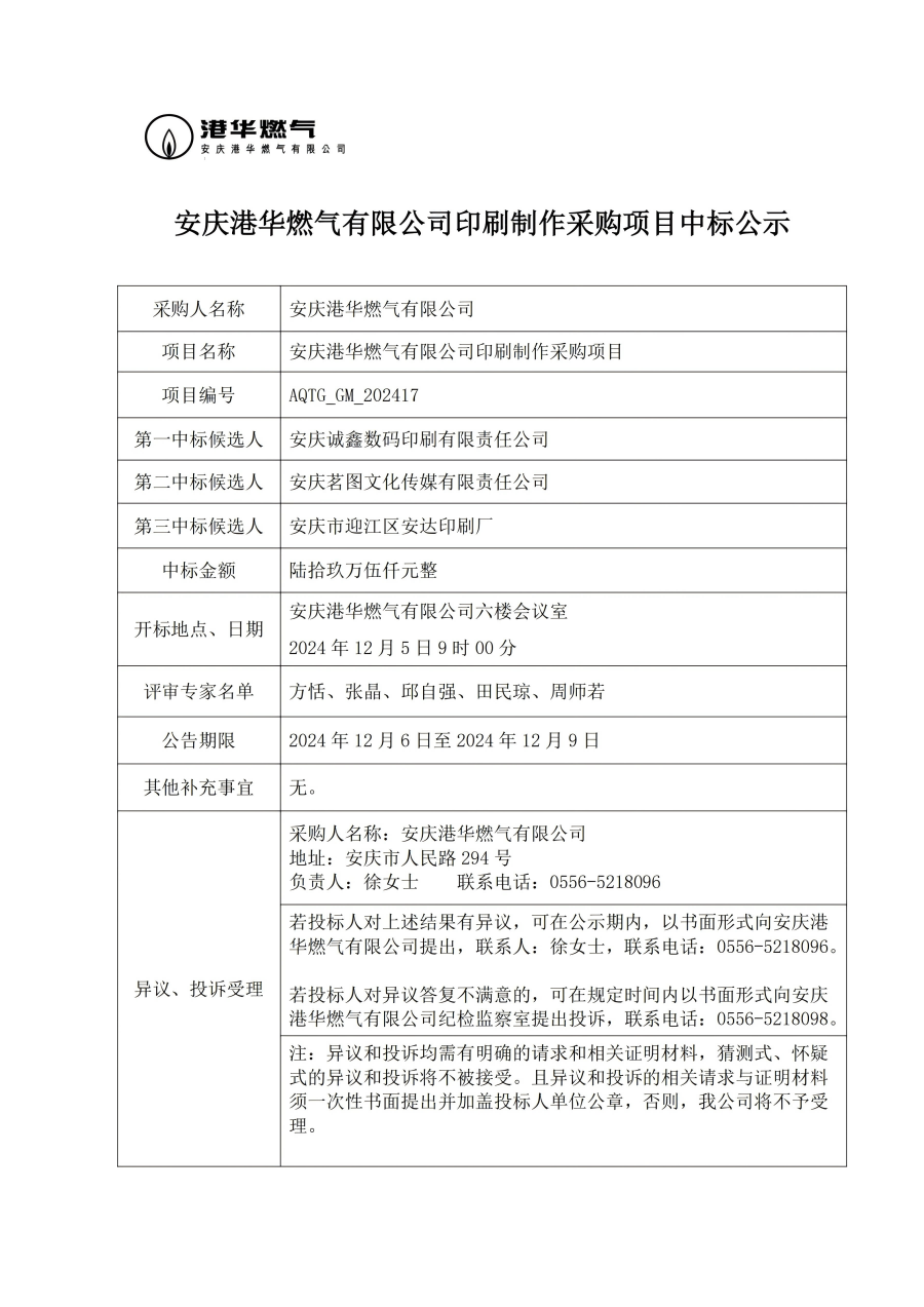 安慶港華燃?xì)庥邢薰居∷⒅谱鞑少忢椖恐袠?biāo)公示