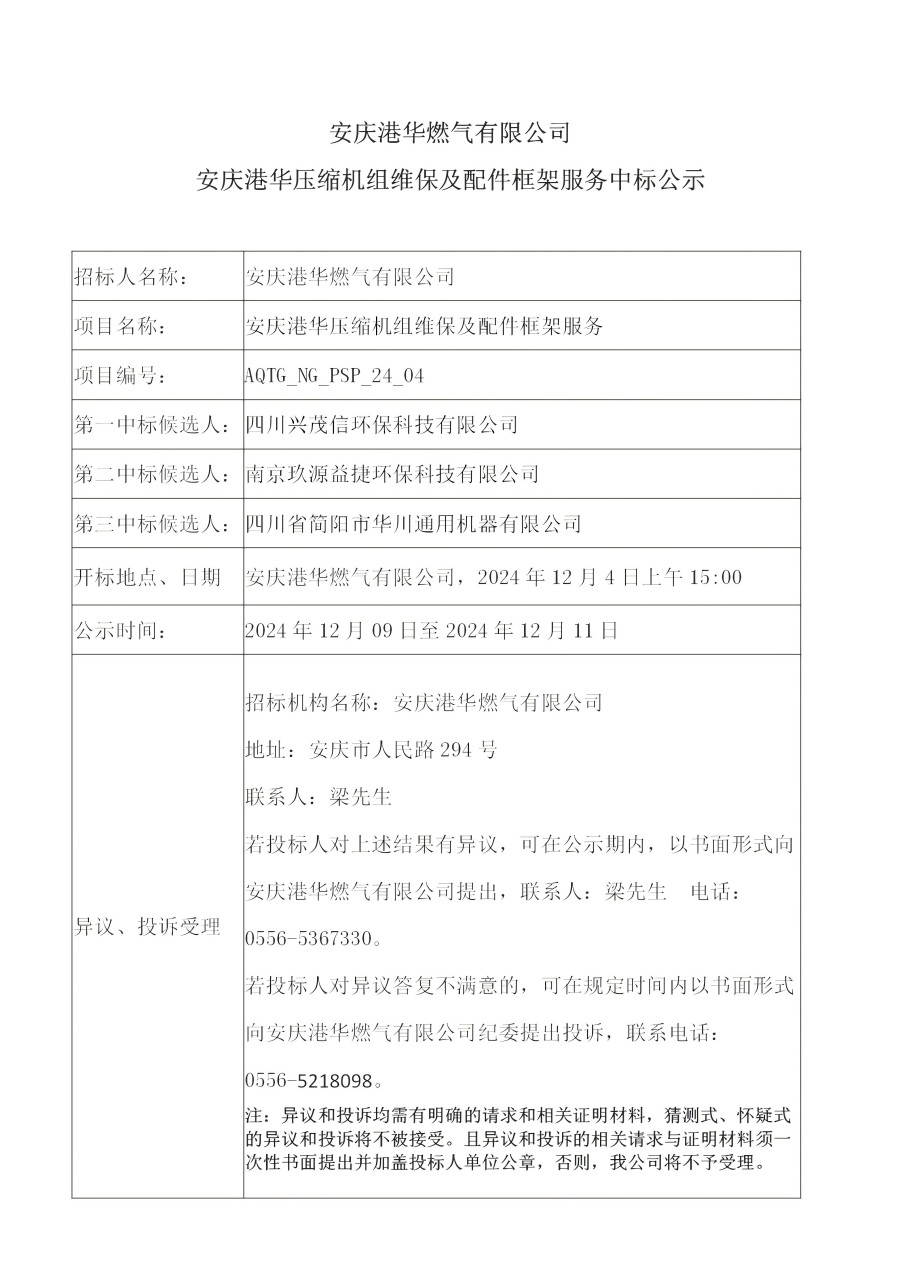 安慶港華燃?xì)庥邢薰景矐c港華壓縮機(jī)組維保及配件框架服務(wù)中標(biāo)公示 發(fā)布時(shí)間:2024-12-09    閱讀次數(shù):3052次