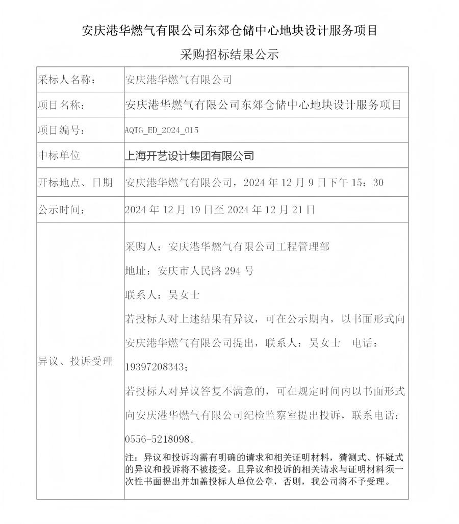 安慶港華燃?xì)庥邢薰緰|郊倉儲中心地塊設(shè)計服務(wù)項(xiàng)目采購招標(biāo)結(jié)果公示 發(fā)布時間:2024-12-19    閱讀次數(shù):2785次