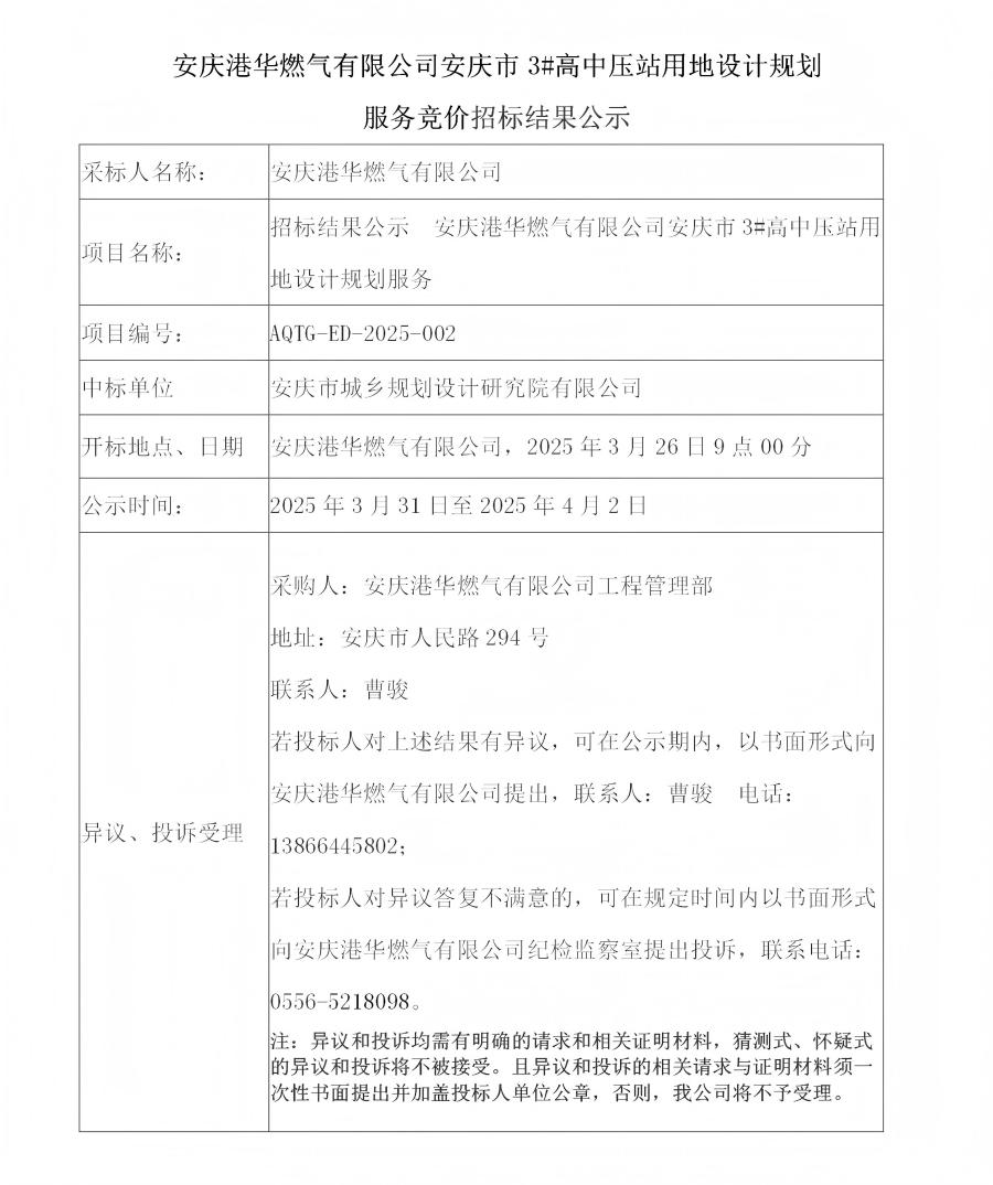 安慶港華燃氣有限公司安慶市3#高中壓站用地設(shè)計規(guī)劃服務(wù)競價招標結(jié)果公示