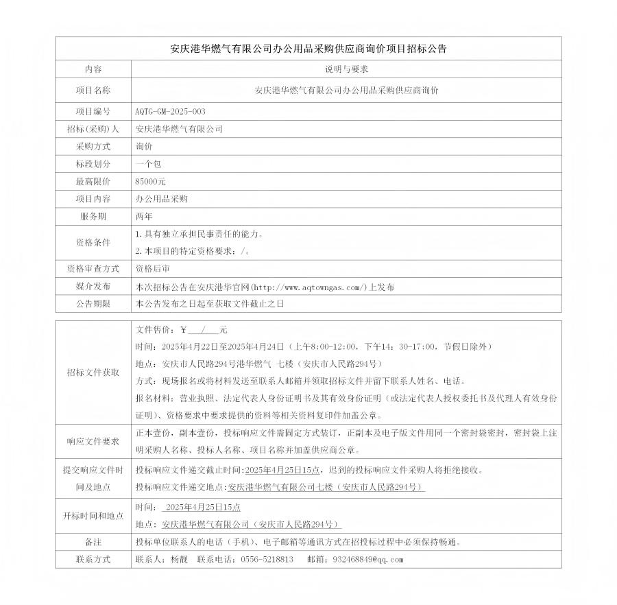 安慶港華燃?xì)庥邢薰巨k公用品采購(gòu)供應(yīng)商詢價(jià)項(xiàng)目招標(biāo)公告 發(fā)布時(shí)間:2025-04-22    閱讀次數(shù):1775次