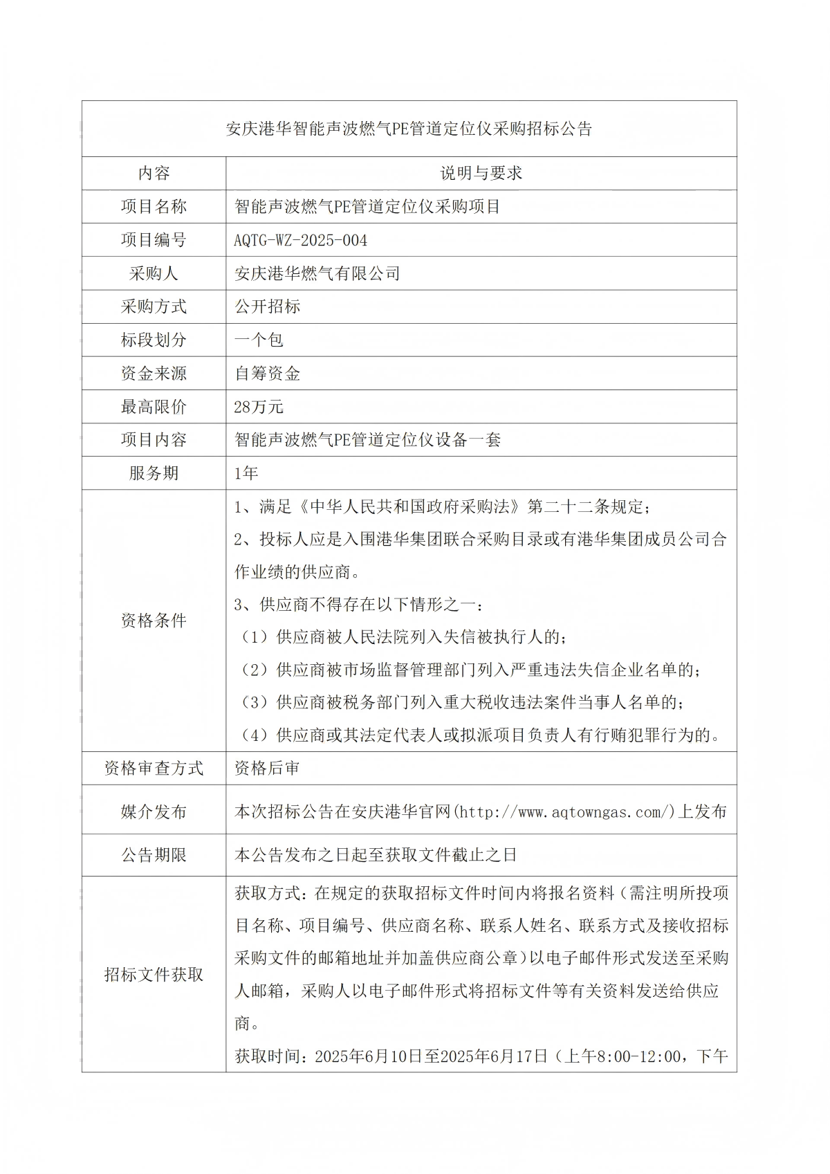 安慶港華智能聲波燃?xì)釶E管道定位儀采購招標(biāo)公告 發(fā)布時間:2025-06-10    閱讀次數(shù):1619次