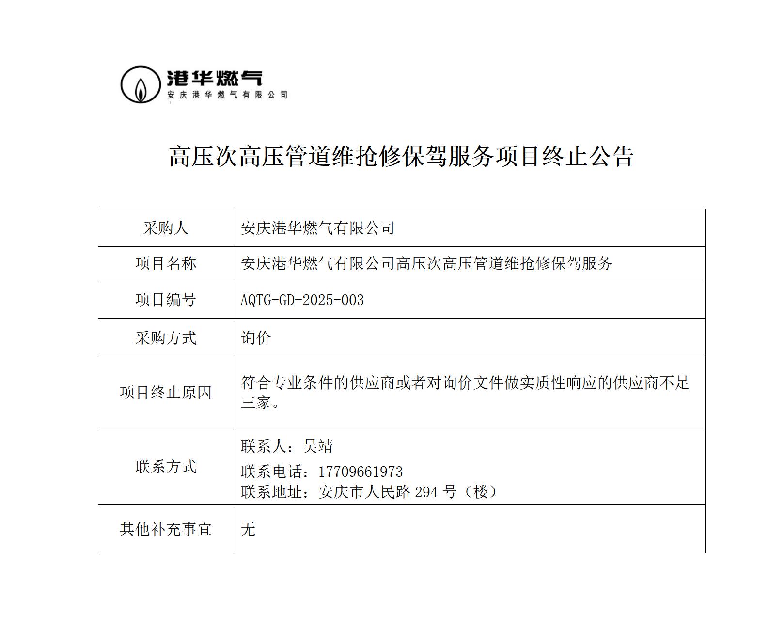 高壓次高壓管道維搶修保駕服務項目終止公告 發(fā)布時間:2025-06-12    閱讀次數(shù):1488次