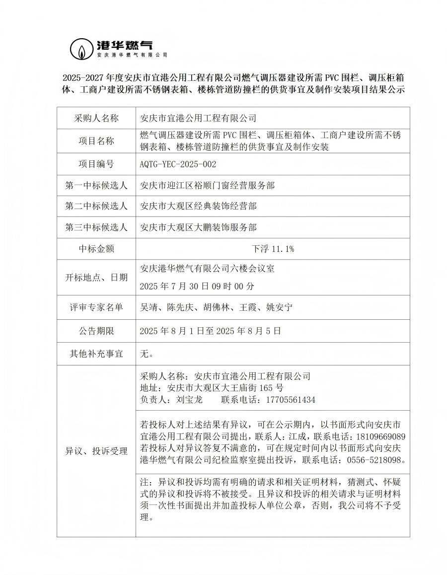 2025-2027年度安慶市宜港公用工程有限公司燃?xì)庹{(diào)壓器建設(shè)所需PVC圍欄、調(diào)壓柜箱體、工商戶建設(shè)所需不銹鋼表箱、樓棟管道防撞欄的供貨事宜及制作安裝項目結(jié)果公示 發(fā)布時間:2025-08-01    閱讀次數(shù):1459次