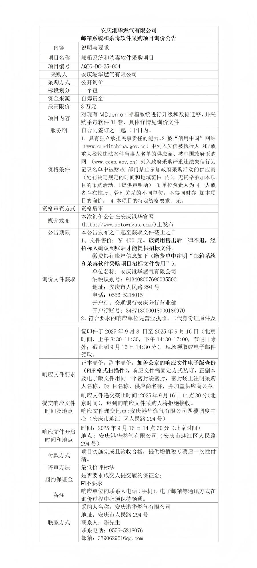 安慶港華燃?xì)庥邢薰距]箱系統(tǒng)和殺毒軟件采購項目詢價公告 發(fā)布時間:2025-09-08    閱讀次數(shù):1233次