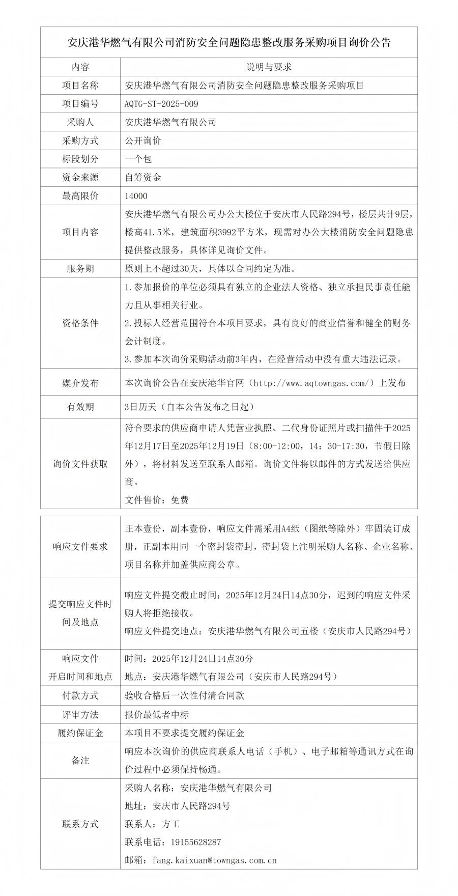 安慶港華燃氣有限公司消防安全問題隱患整改服務(wù)采購項目詢價公告 發(fā)布時間:2025-12-17    閱讀次數(shù):692次